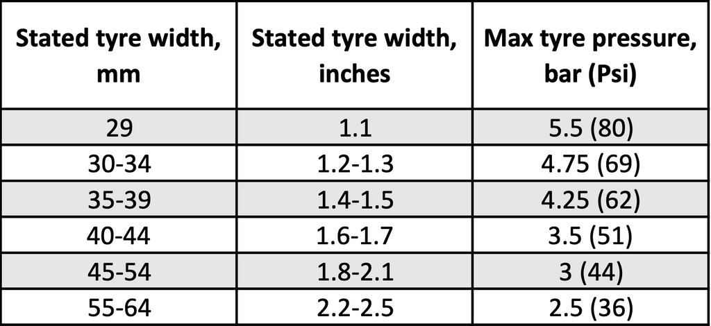Tyres InfoHUNT recommends a 40mm tyre for best performance, tyre widths between 29mm and 64mm are also safe to use. Note: best performance is usually gained by using tyre pressures lower than the maximum, you can see our blog post about this, read here. Tubeless-ready for lower weight and rolling resistance. You must not exceed the maximum tyre pressure limits set out in the table below or the maximum limit set by your tyre manufacturer if this is lower.