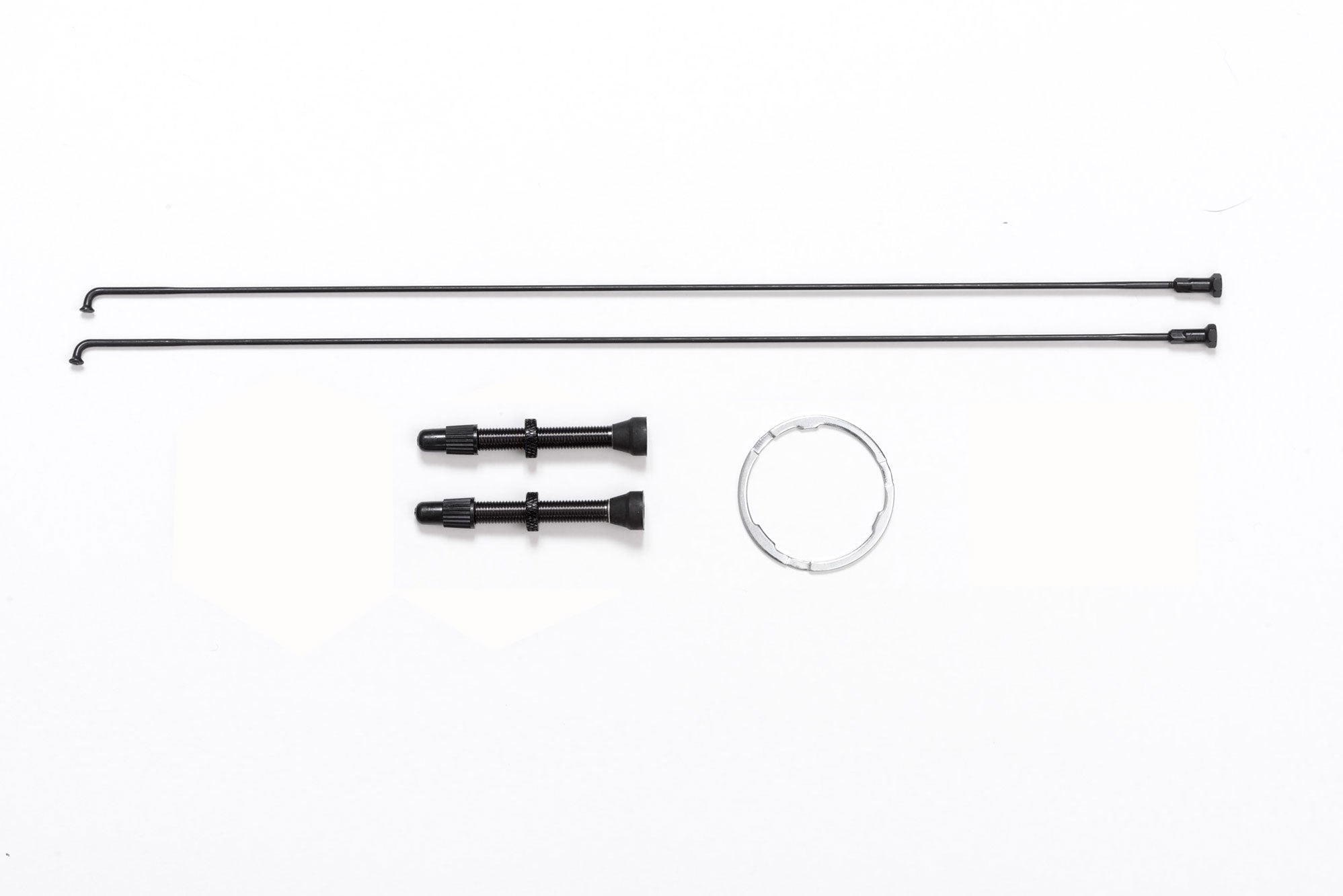 SpokesJ-bend cold drawn. Made from high grade T302 (18/10) stainless steel wire by Sandvik Sweden. Triple butted 2.0-1.6-2.0 (then 2.2 at the head for the patented Pillar Spoke Re-enforcement). 28 spokes laced 2 cross front and rear. Black stainless treatment.