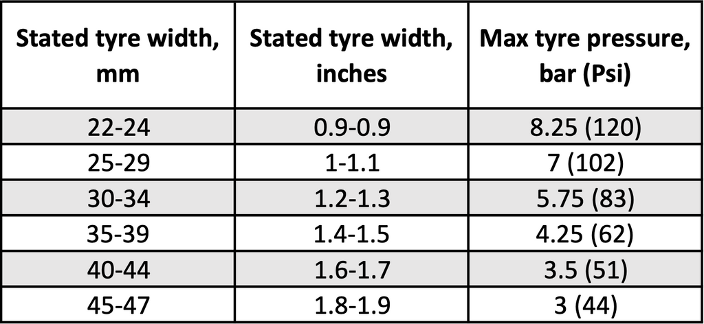 Tyres InfoHUNT recommends a 25-28mm tyre for best performance, tyre widths between 22mm and 47mm are also safe to use. Note: best performance is usually gained by using tyre pressures lower than the maximum, you can see our blog post about this, read here. Tubeless-ready for lower weight and rolling resistance. You must not exceed the maximum tyre pressure limits set out in the table below or the maximum limit set by your tyre manufacturer if this is lower.