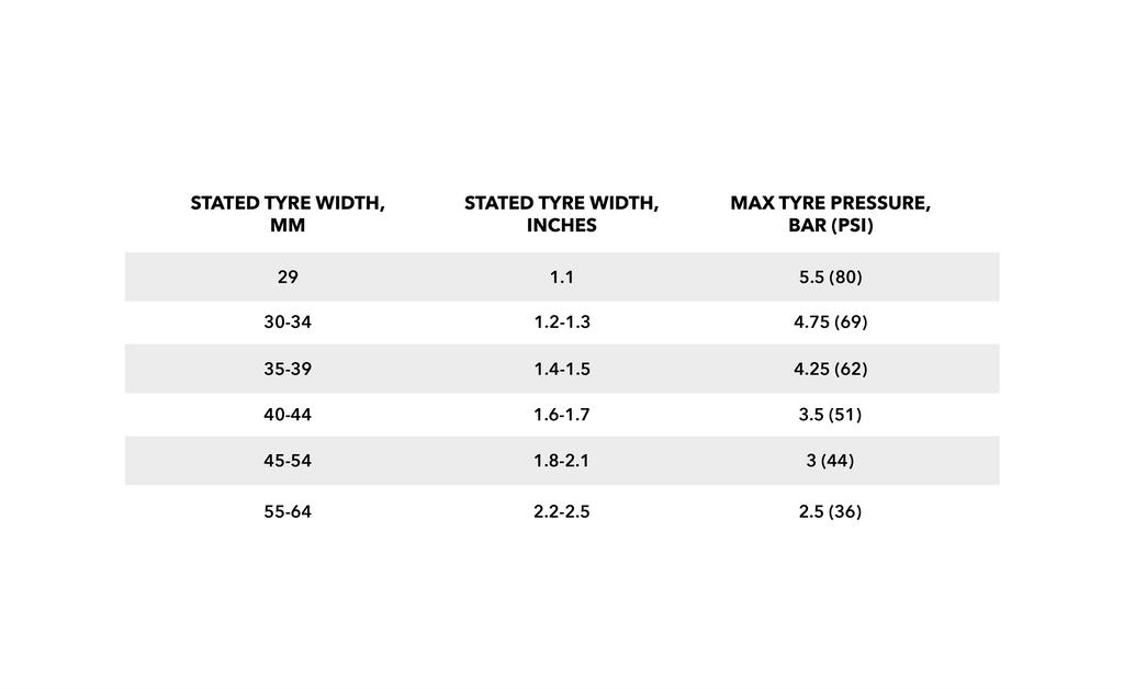 • Note: best performance is usually gained by using tyre pressures lower than the maximum, you can see our blog post about this, read here.