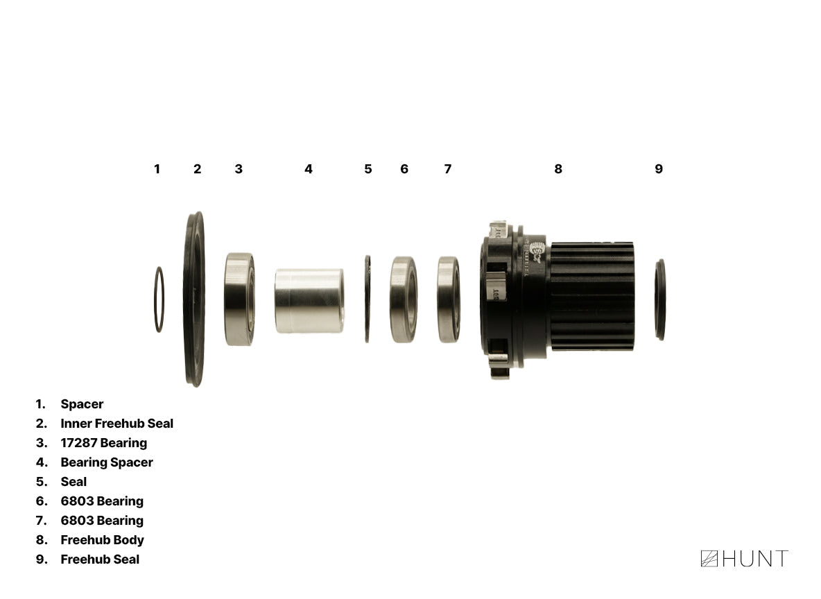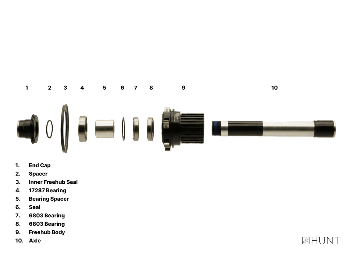 Freehub bearings from left (hub side) to right (end cap side):