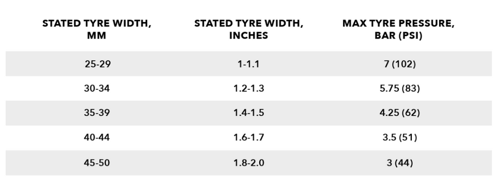 Tyre InfoHUNT recommends a 25-35mm tyre for best performance, tyre widths between 25mm and 50mm are also safe to use. Note: best performance is usually gained by using tyre pressures lower than the maximum, you can see our blog post about this, read here. Tubeless-ready for lower weight and rolling resistance. You must not exceed the maximum tyre pressure limits set out in the table below or the maximum limit set by your tyre manufacturer if this is lower.