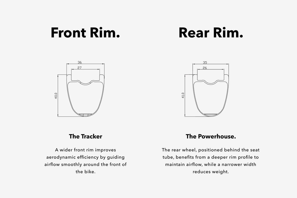 RimsWind tunnel tested, aerodynamically optimised for tyres over 40mm Mixed rim profiles with Limitless Width technology for Aero optimization: - Front rim dimensions: 40mm deep | 36mm external width | 27mm internal width - Rear Rim dimensions: 41mm deep | 35mm external width | 26mm internal width H-lock tyre security channel Pinch flat protection with 4.5mm bead thickness Additional spoke hole reinforcement patches for bike-packing loads Unidirectional T24/30 carbon fibre with 3K weave re-enforced spoke holes Hookless TSS profile for optimised weight and strength Reflective graphics with matte clear coat