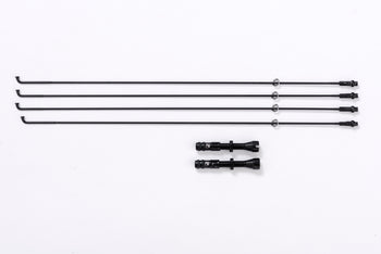 SpokesPillar Wing with Aerofoil 24 front and 28 rear interlaced Aero Butted 2.0-2.2/0.95-2.0 then PSR section is 2.2 J-bend for durability and ease of replacement Cold drawn from high grade T302 (18/10) stainless steel wire by Sandvik Sweden Patented Pillar Spoke Re-enforcement, butted again just before the spoke head providing more durability in high stress area Black stainless treatment