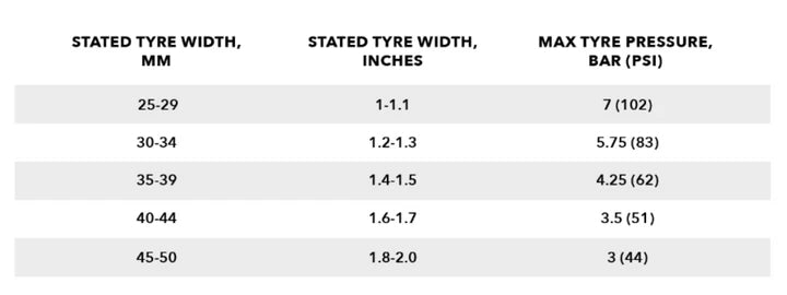 Tyres InfoHUNT recommends a 25-40mm tyre for best performance, tyre widths between 25mm and 50mm are also safe to use. Note: best performance is usually gained by using tyre pressures lower than the maximum, you can see our blog post about this, read here. Tubeless-ready for lower weight and rolling resistance. You must not exceed the maximum tyre pressure limits set out in the table below or the maximum limit set by your tyre manufacturer if this is lower.