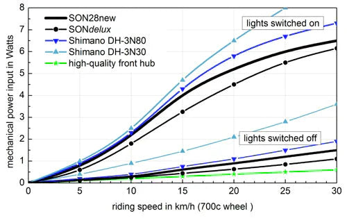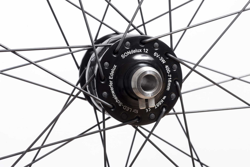 SONdelux Front HubSONdelux 12mm 3 Watt | 6 Volt output at 18-19kmh. Tested to German road traffic regulations (StVZO) standard K687 for output requirement. Efficiency: 65% at 15 km/h in 700c wheel. No-Load Power Input: 0,4 W at 15 km/h in 700c wheel Magnets: neodymium boron, 26 poles. Connection: 4.8 mm flat spades, 2-pin, to connect without ground connection (special design without connectors). Axle Ends: stainless steel. Bearings: deep groove ball bearing 629-2RSH (SKF). Hub Shell: aluminium 6082-T6. Sealing: alloy dust shields, rubber lip seals and a pressure compensation system which prolongs bearing life by reducing water being drawn into the hub system. Hub warranty: 5 years. Weight 395g. Center-lock disc mount. If you require a 6-bolt adaptor you can purchase it separately here.