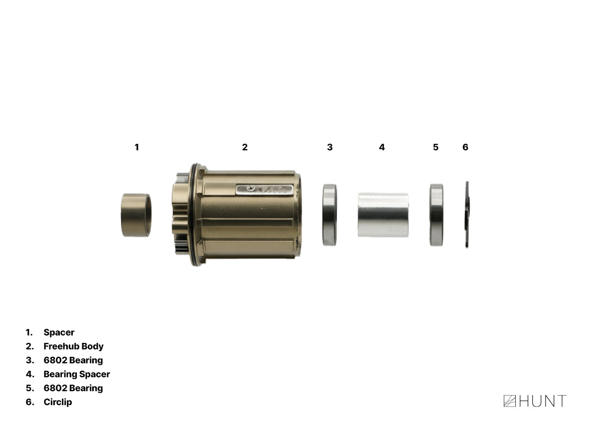 Freehub bearings from left (hub side) to right (end cap side):