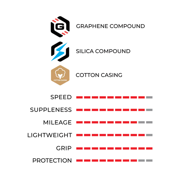 The Race Formulation powered by Graphene + Silica is a high-performance compound mix developed for pro-level racing. It delivers an optimal balance of speed and grip, offering maximum efficiency in straight-line performance with confident handling in corners.